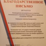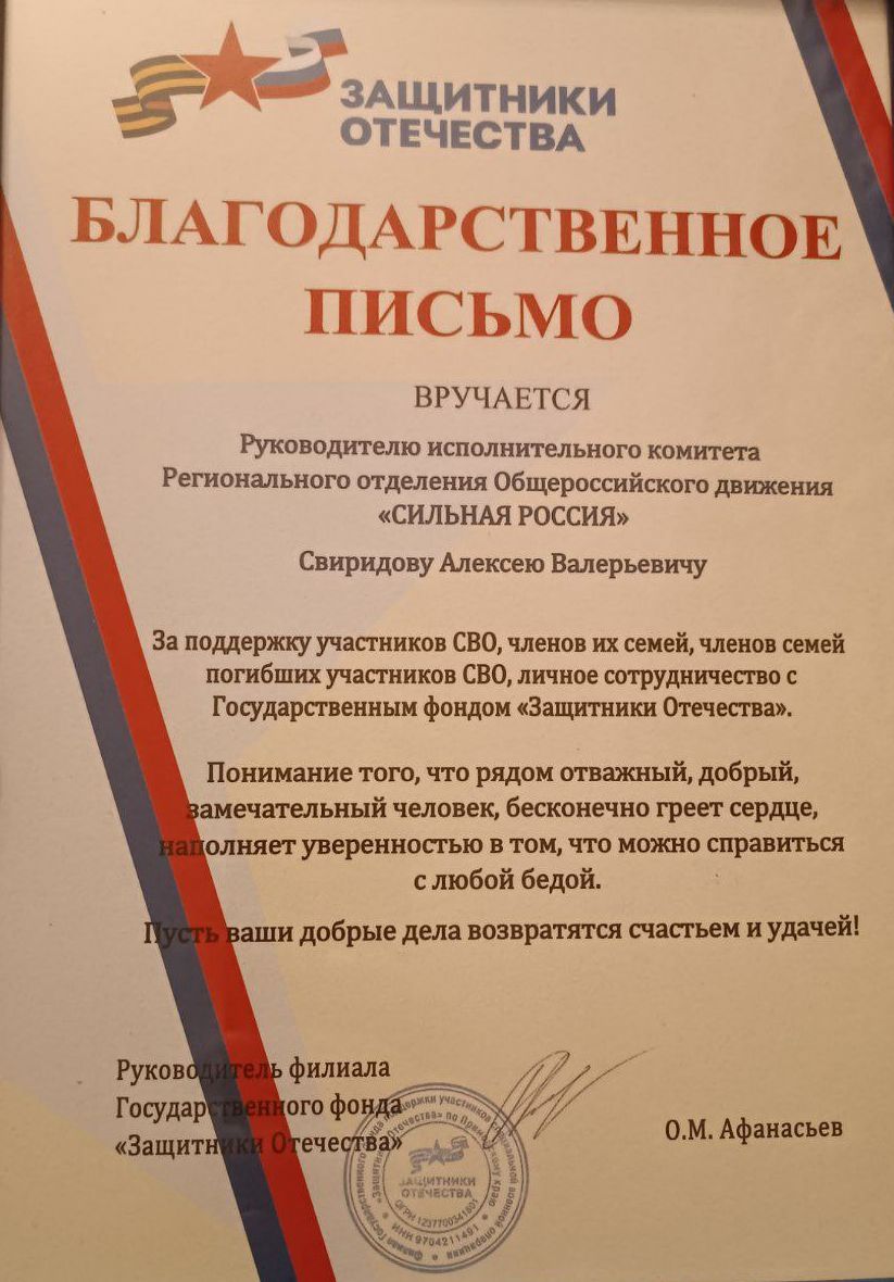 Руководство филиала Фонда «Защитники Отечества» Приморского края выразило благодарность Алексею Свиридову за помощь участникам СВО, членам их семей, членам семей погибших воинов и личное сотрудничество.